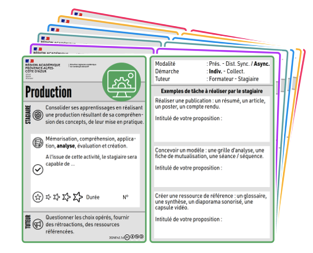 Inspiré de la méthode de scénarisation ABC Learning Design, cet outil est constitué d’un tableau de bord de conception et de six cartes principales, chacune correspondant à un type d’activité d’apprentissage et de trois cartes transversales portant sur la taxonomie de Bloom, les quatre piliers de l’apprentissage et les 4 piliers de la motivation. L’ensemble est regroupé dans le kit « Scénariser sa formation » disponible sous licence CC-BY-NC-SA et librement téléchargeable. (d’après le site de l’académie Aix-Marseille)